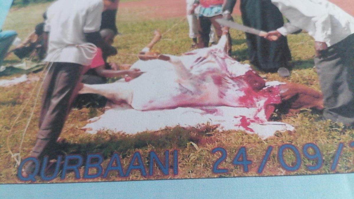 This an Islamic Ritual practiced during last month of Islamic Calendar called Dhil-Hijj. Different types of animals are slaughtered including goats, Sheep, Cows, Camel, small animals like goats and sheep is are slaughtered one person one animal, but big animals like cow and camel are slaughtered seven people for one animal. and meat is distributed among friends and family rich or poor, and also needy people and to those who are poor.